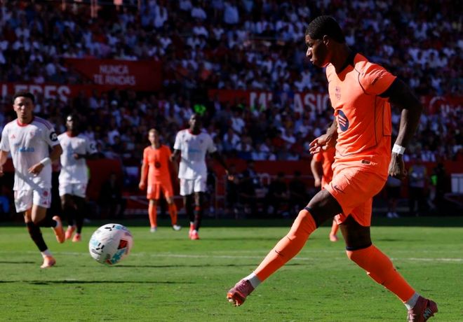 第43分钟,拉什福德在禁区左侧获得直面门将的机会,只可惜他的射门被挡了出去。随后,桑切斯也获得单刀机会,但他没有及时射门,结果被回防的阿劳霍给破坏了。半场补时读秒阶段,巴萨终于扳回一球。拉什福德在禁区左侧接到佩德里的传球,直接射门,皮球应声入网!半场结束,巴萨1-2塞维利亚。